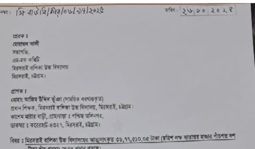 মিরসরাই বালিকা বিদ্যালয়ের প্রধান শিক্ষকের বিরুদ্ধে তহবিল আত্মসাতের অভিযোগ